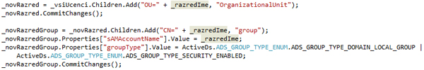 Kot primer kode lahko kreiranje zgolj posamezne organizacijske enote ter skupine vidite tu spodaj.