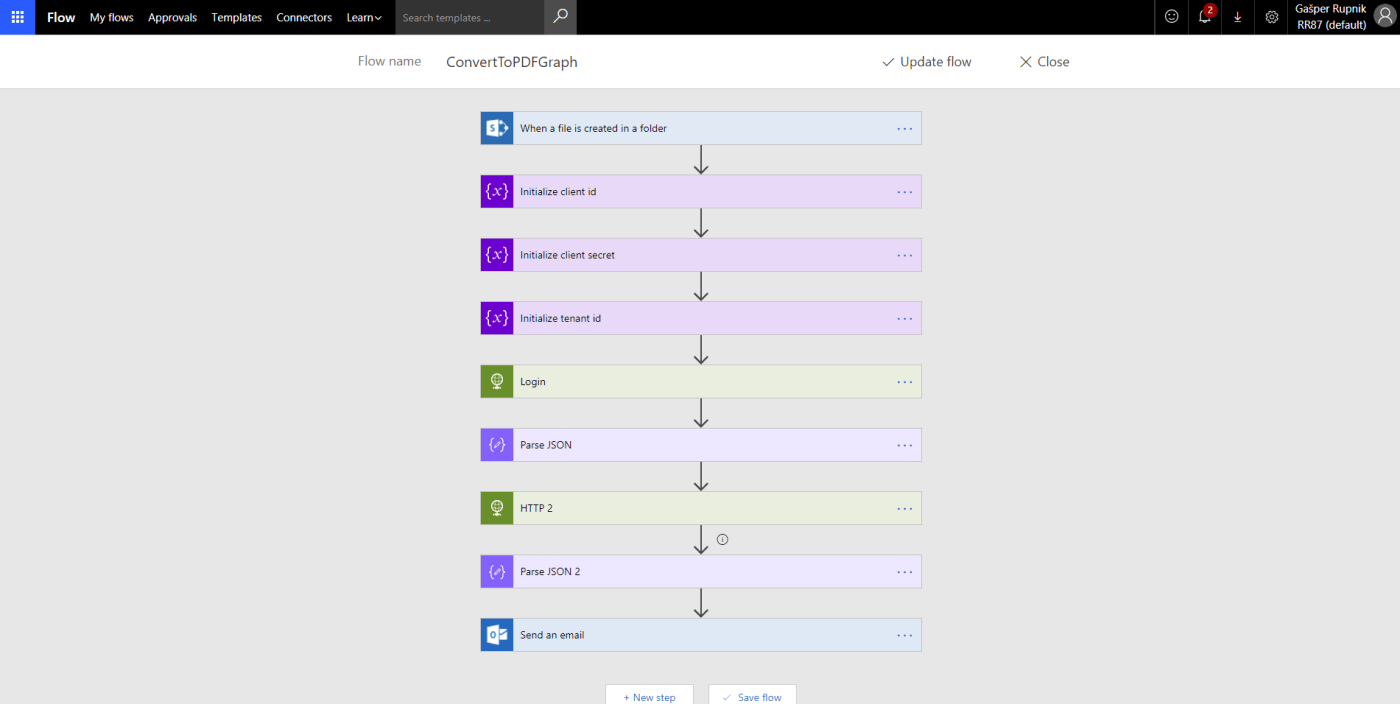Than we have to make authentication with Microsoft Cloud. Make sure that you use tenant_id, client_id and client_secret variables made before and specify resource URL. Use HTTP – HTTP flow action.