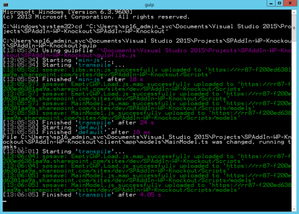 All script files and HTML templates are immediate upload to SharePoint Server when they changed. No solution deployment needed. Just first time, when you create SharePoint solution with blank WebPart inside of the Feature. This enables you to develop faster and simplier. Continue reading “SharePoint KnockoutJS Blank Templates with Gulp watch for changes”